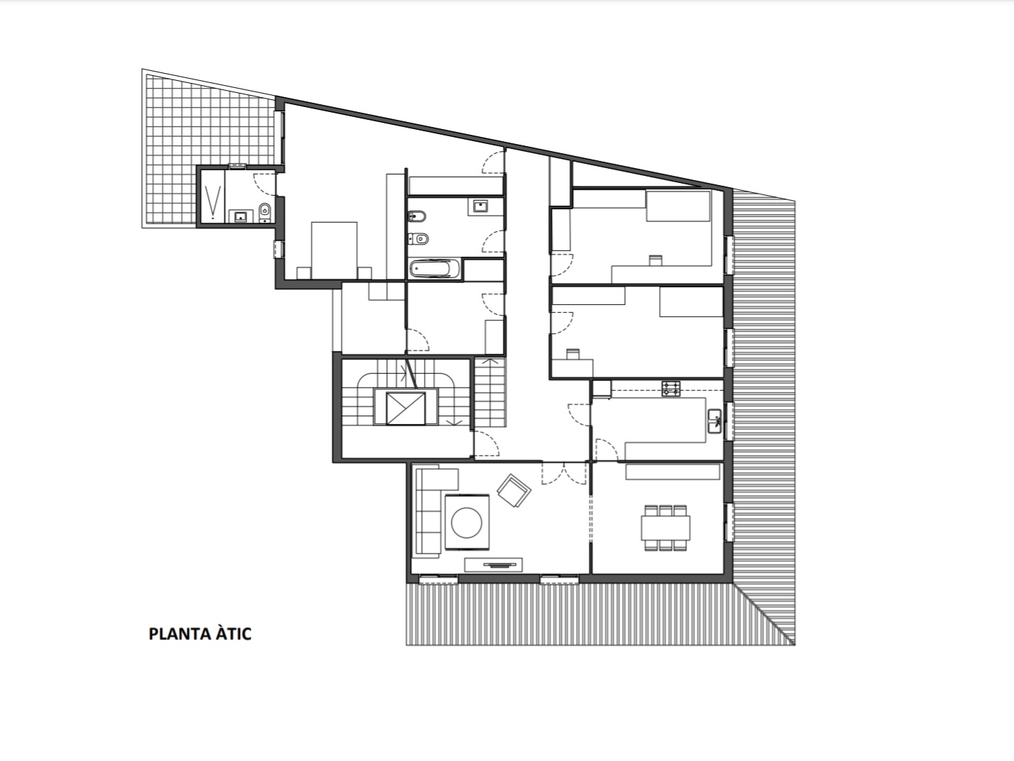 • Planta Àtic: (habitatge 105m2, terrasses 75m2)): gran habitatge de 3 dormitoris amb sortida a 2 àmplies terrasses (una perimetral i una altra amb vistes obertes). És possible crear més dormitoris.