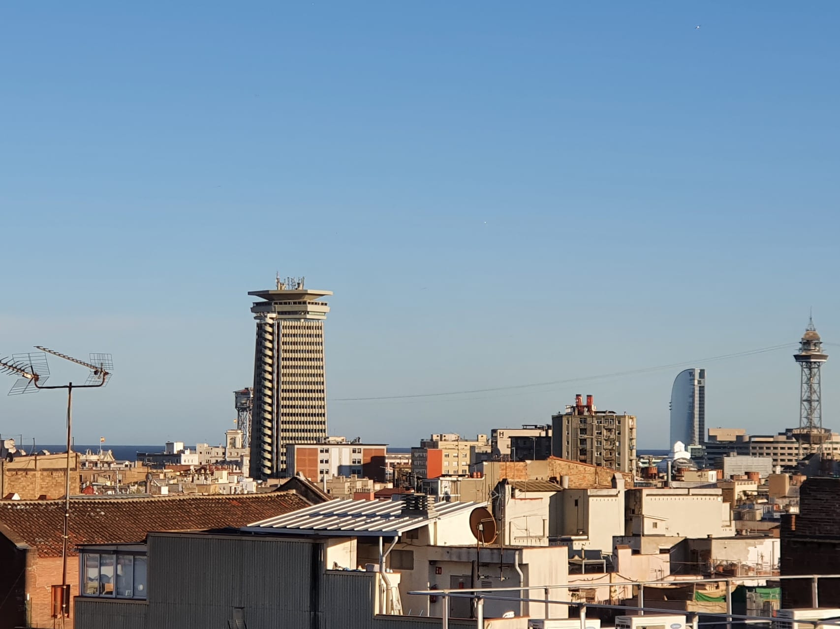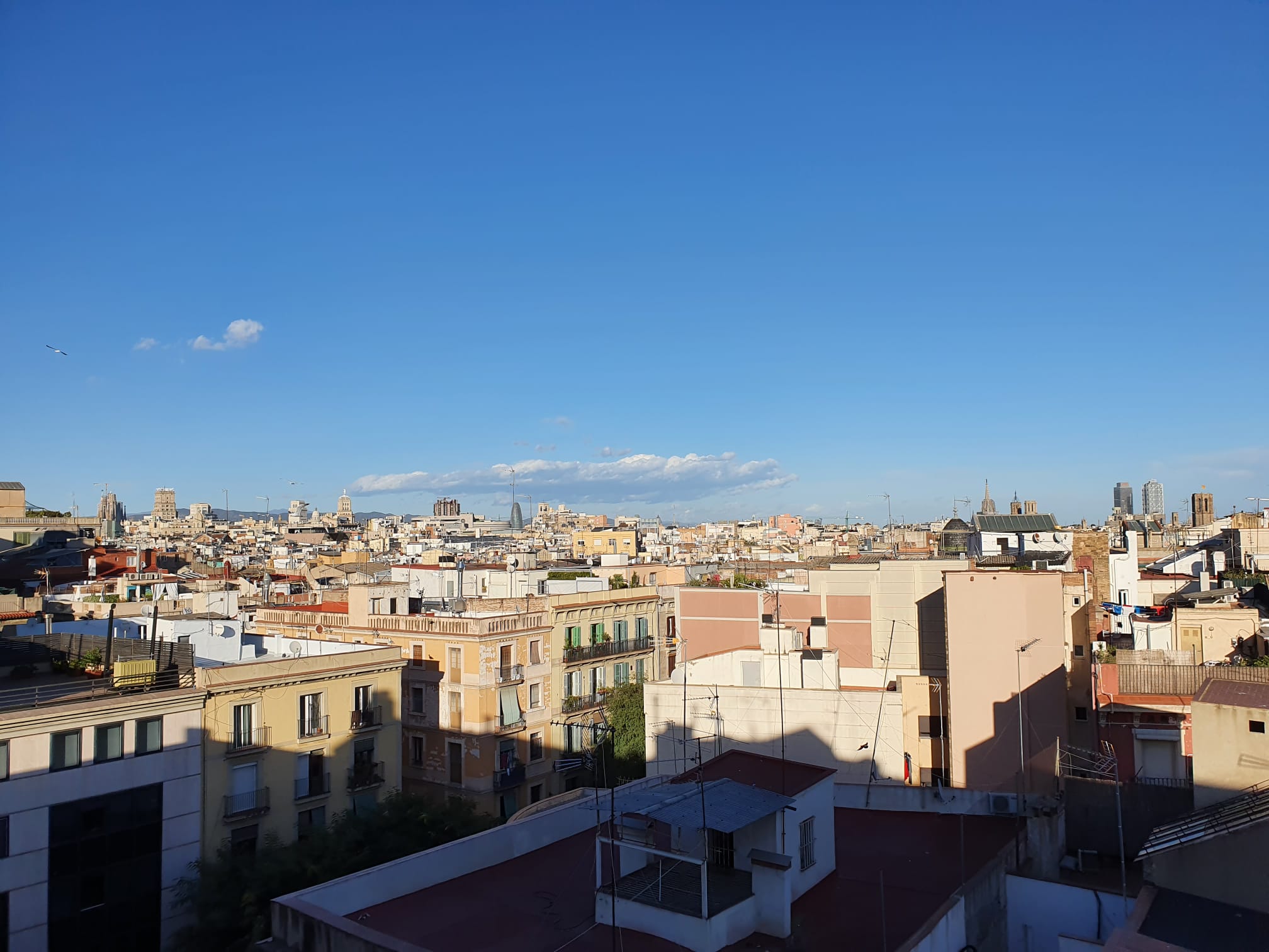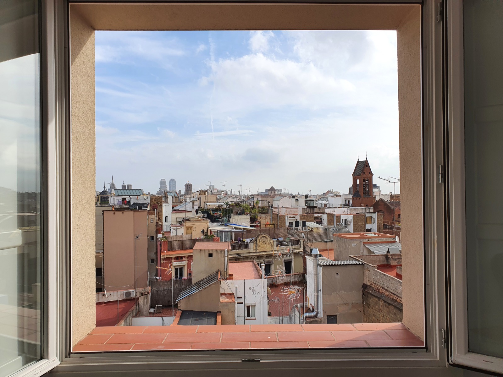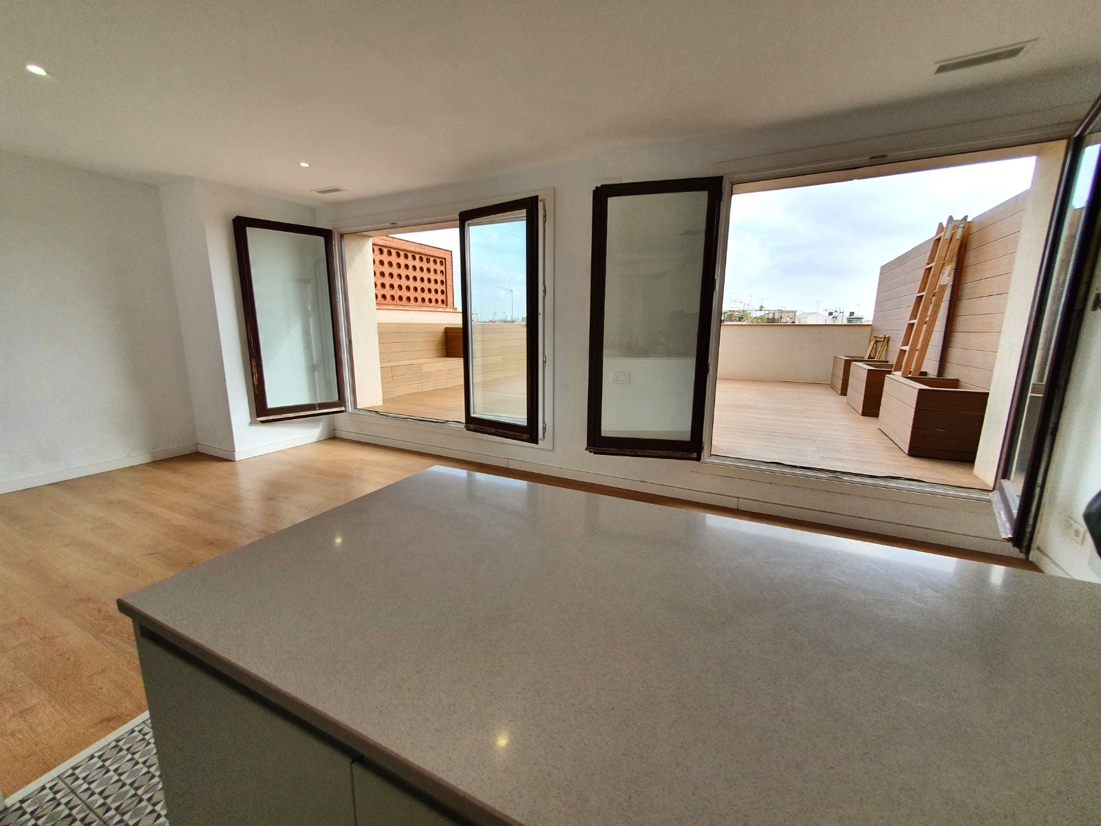 The apartment (90m2 according to the land registry) occupies the penthouse and top floor of the building. It features a luxurious terrace (30m2) seamlessly integrated into the apartment through expansive glass openings, offering spectacular panoramic views of the Barcelona skyline and its iconic landmarks.