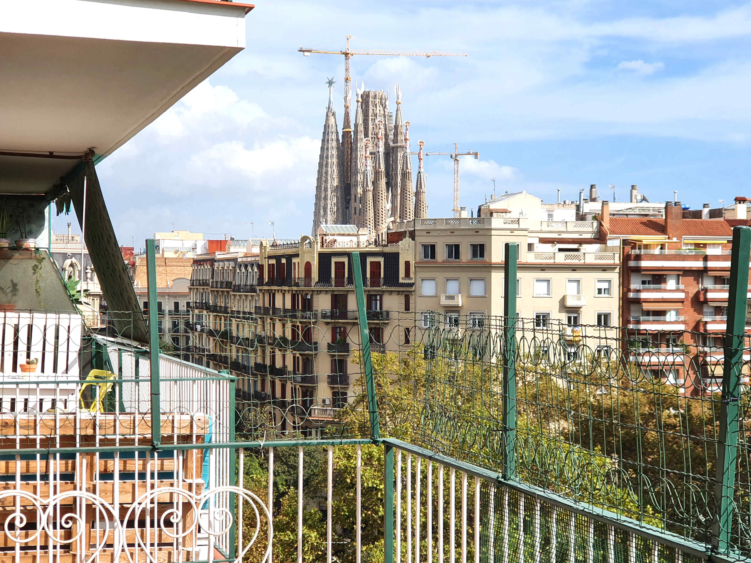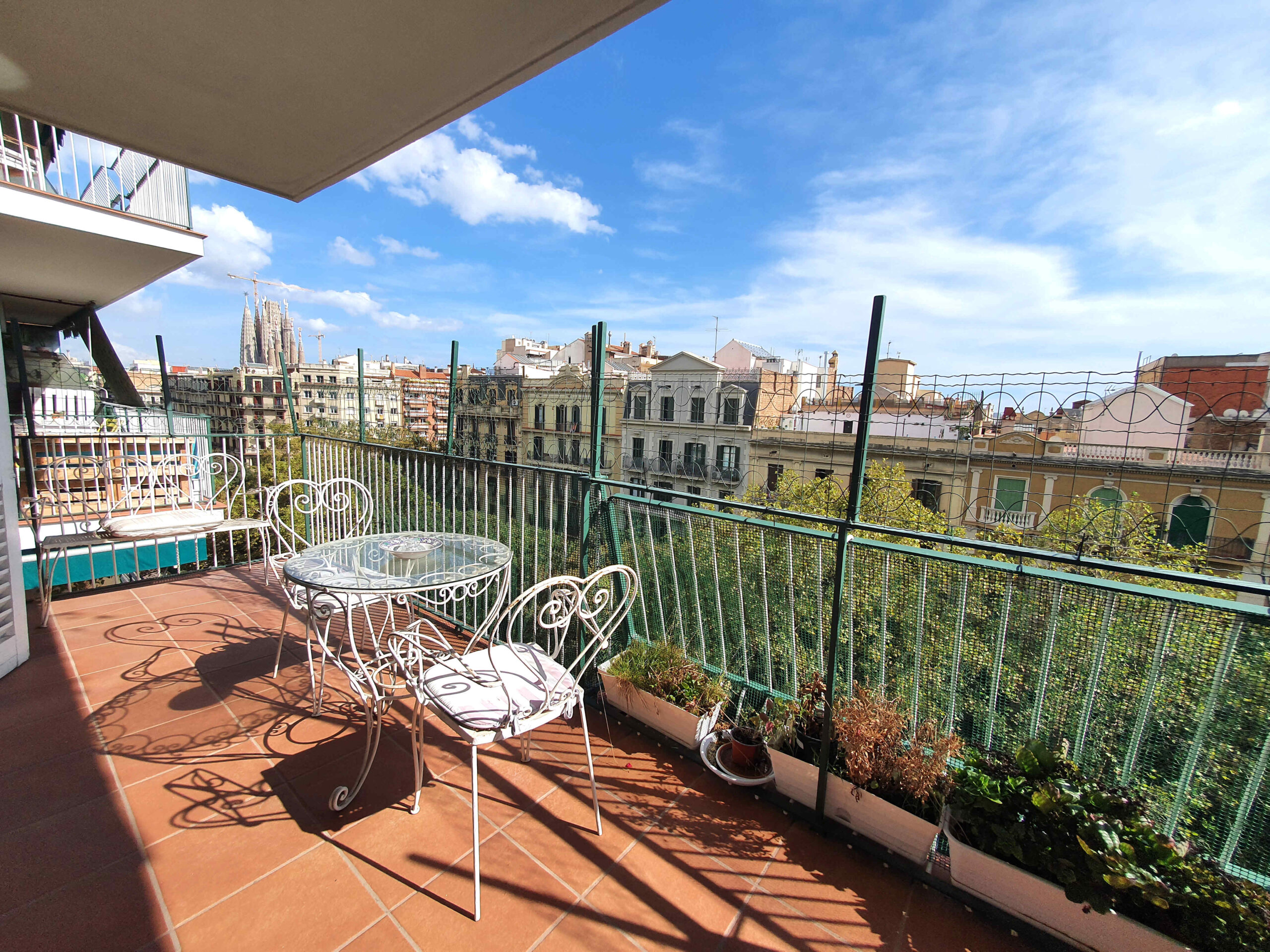 Zona día: Salón, cocina, vestíbulo, lavadero y amplia y soleada terraza orientada a mar con preciosas vistas a la Sagrada Familia.